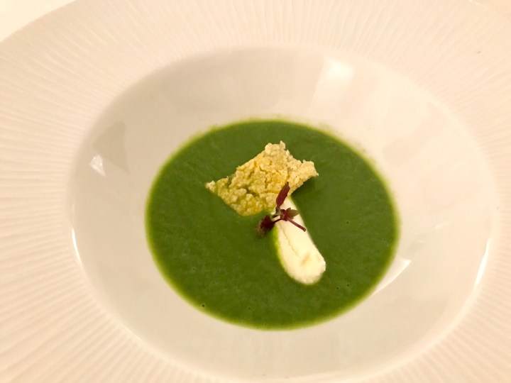 The ‘welcome of the kitchen’ is a cream of lettuce with ricotta, paired with a sparkling Grillo from Sicily.