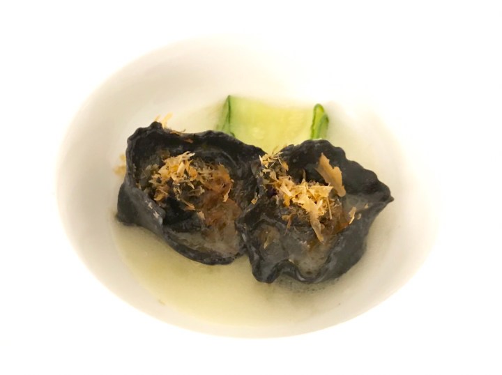 Next is ravioli colored with squid ink and stuffed with tuna, garnished with Japanese katsuobushi (so a bit of fusion). The ravioli are delicious and the smoky flakes really add something to the dish. It is paired well with a Negroamaro rosé from Puglia. 8/10