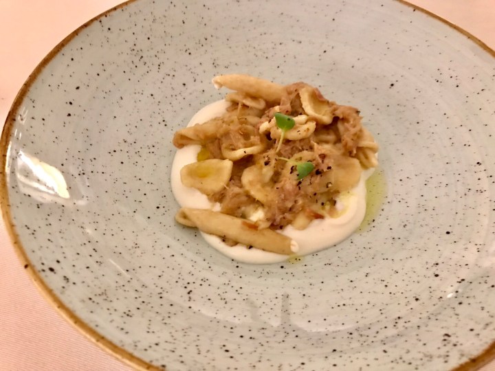 Orecchiette with a ‘white’ lamb ragù and cream of ricotta. The ragù is very creamy and flavorful, and the accompanying Frappato from Sicily that is slightly fizzy does a very good job of cleaning the palate. 9/10