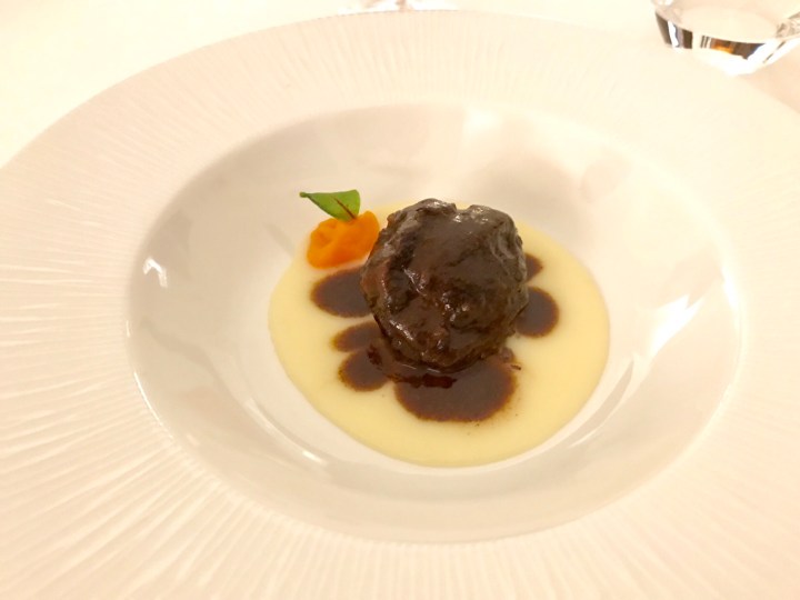 Veal stewed in Aleatico wine with cream of potatoes and carrots. The veal is very flavorful and tender (you could eat it with a spoon) and works very well with a 2008 Montepulciano d’Abruzzo. A big compliment to the sommelier for serving this wine at the right age. Because not only is the wine at its peak, it also works much better with a dish like this. The wine is in great balance with present but well integrated tannins. 9/10