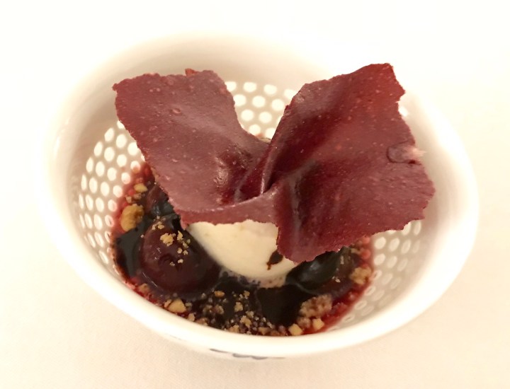Dessert: cherries poached in Aleatico wine with chocolate, and served with a glass of Aleatico wine. The wine is just sweet enough to work with the dessert. 8/10