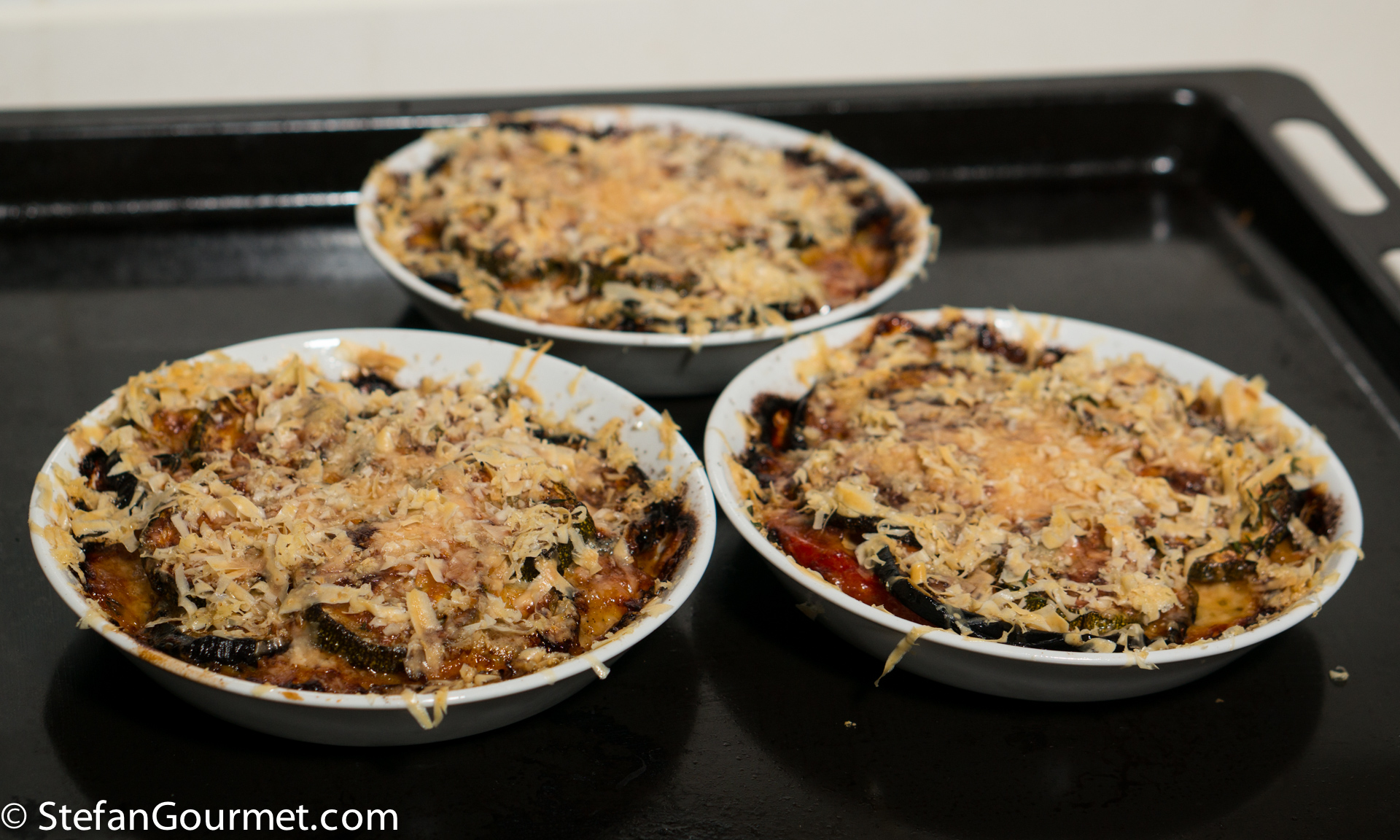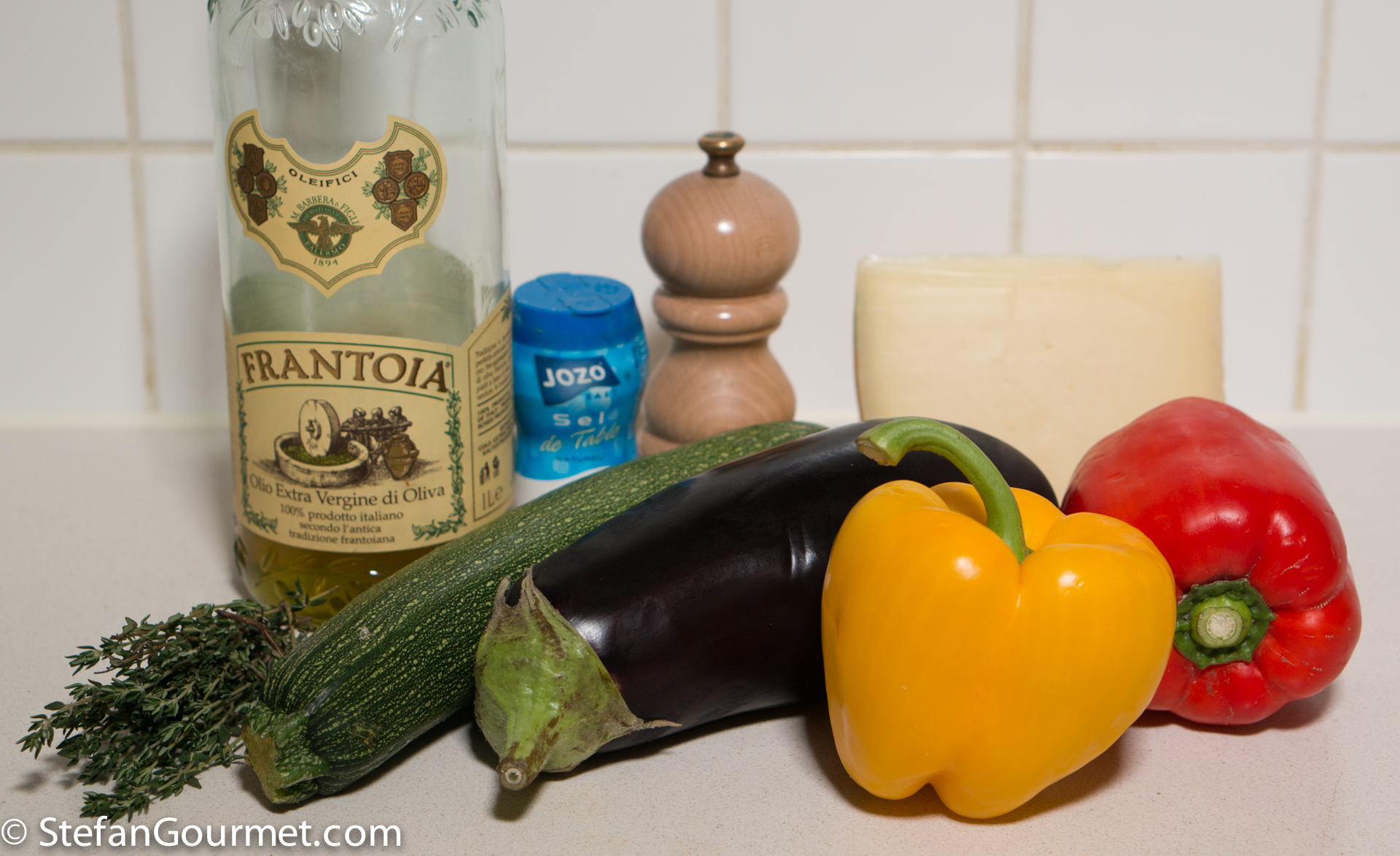 This dish was inspired by something we had in a restaurant in Corsica last year: roasted eggplant, zucchini, and bell peppers, that are subsequently baked with a generous amount of cheese. The Sardinian pecorino I used for my own rendition was a bit too dry so it did not melt properly, but it tasted great all the same. The vegetables take a lot longer to cook (especially the eggplant; with peppers and zucchini it is not such an issue if they are still a bit raw, but raw eggplant is like banana peel) than the cheese to melt, that is why the vegetables need to be roasted before adding the cheese. The result is very tasty and can be served as an appetizer, side dish, for lunch, or as a vegetarian main course.
