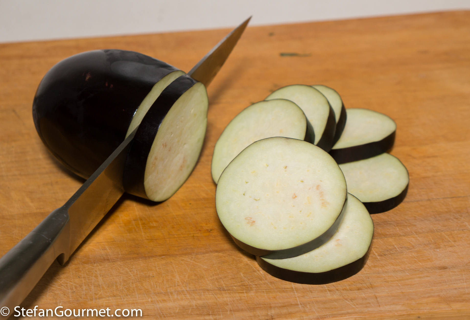 Remove both ends of the eggplant, and cut it into slices of about 8 mm (1/3 inch). Do the same with the zucchini.