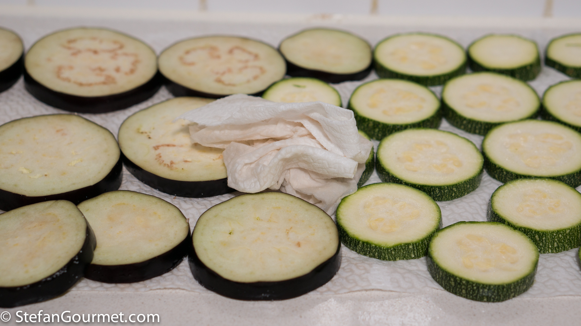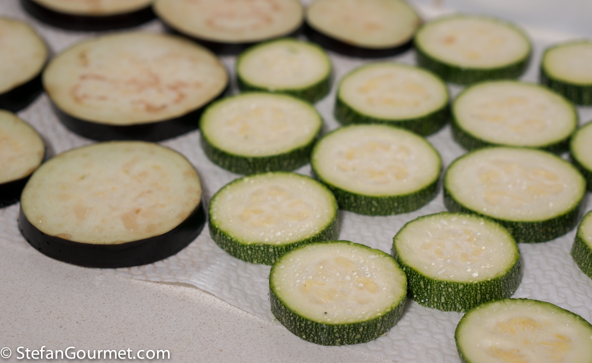 Arrange the eggplant and zucchini slices in a single layer on kitchen paper, and sprinkle with sale on both sides. Allow the salt to draw out some of the water for at least half an hour.