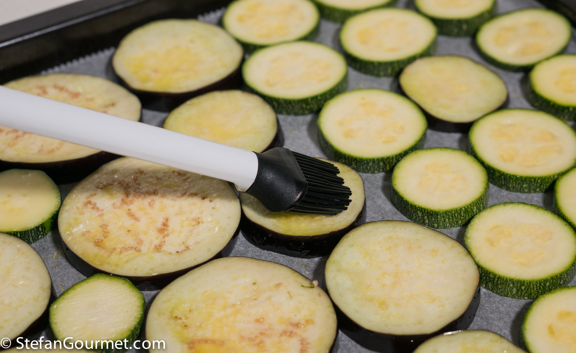 Arrange the eggplant and zucchini in a single layer on a baking sheet that you covered with parchment paper, and brush them on all sides (top, bottom, and sides) with olive oil.