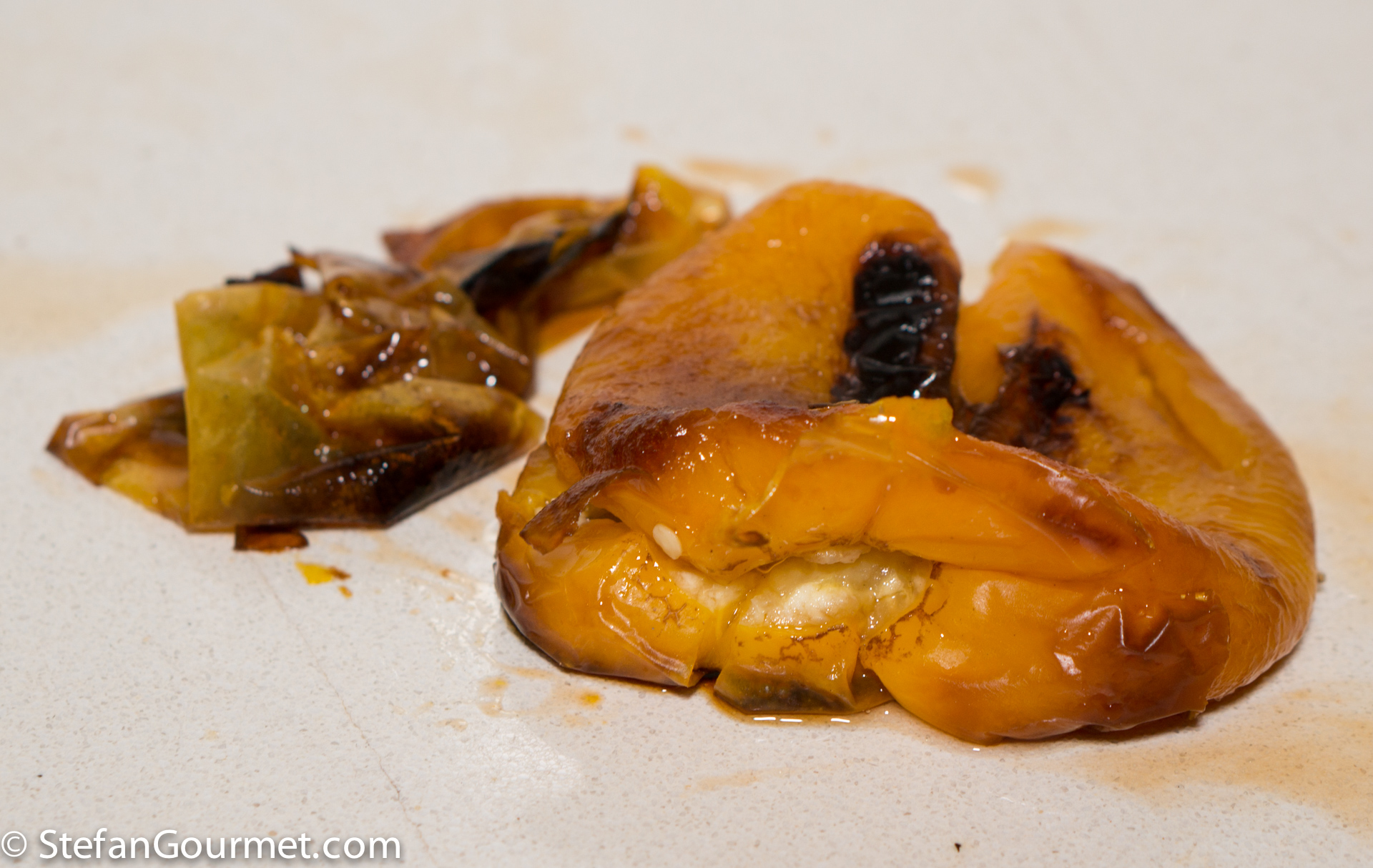 Meanwhile, the peppers should have cooled enough that you can peel them.