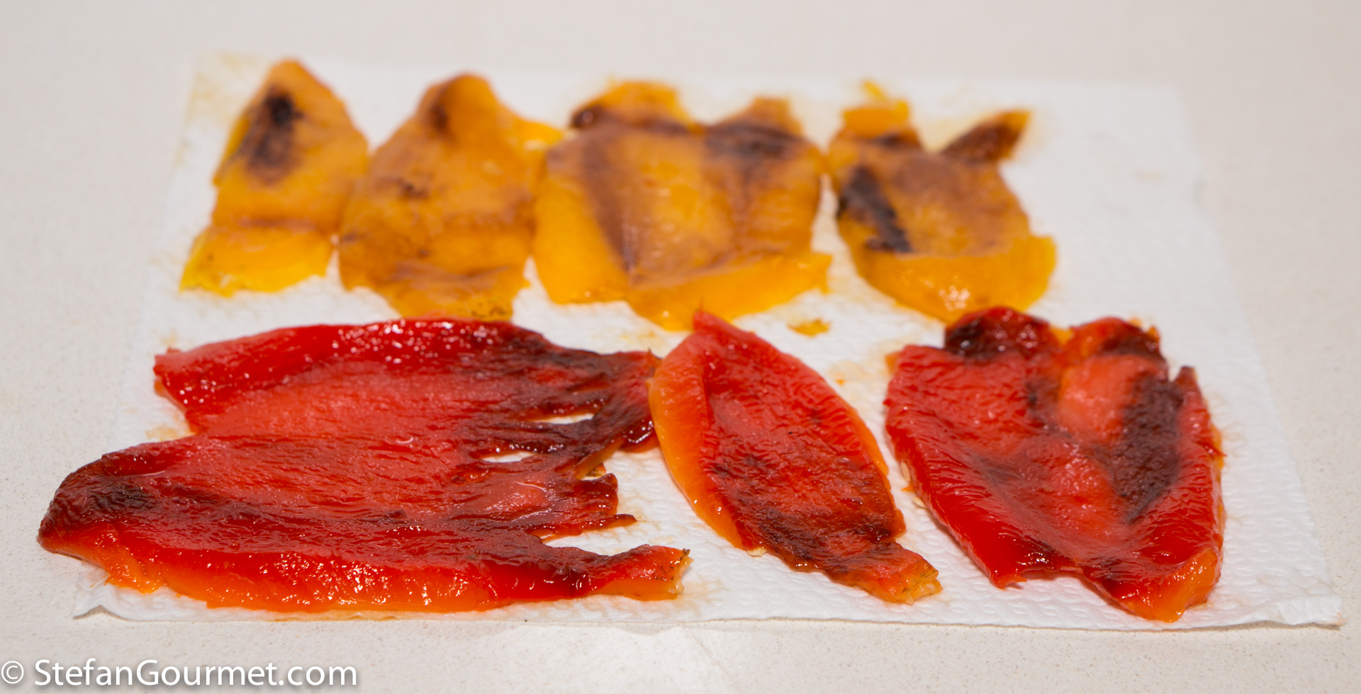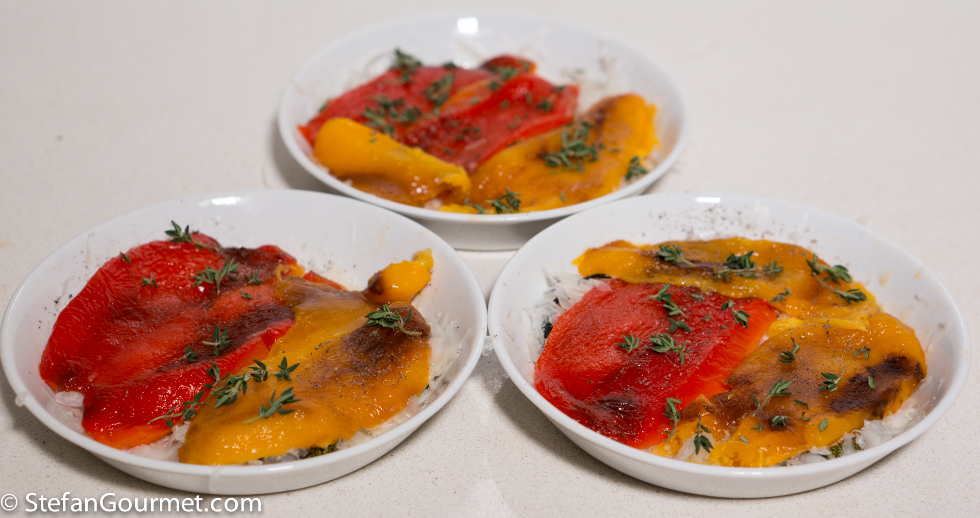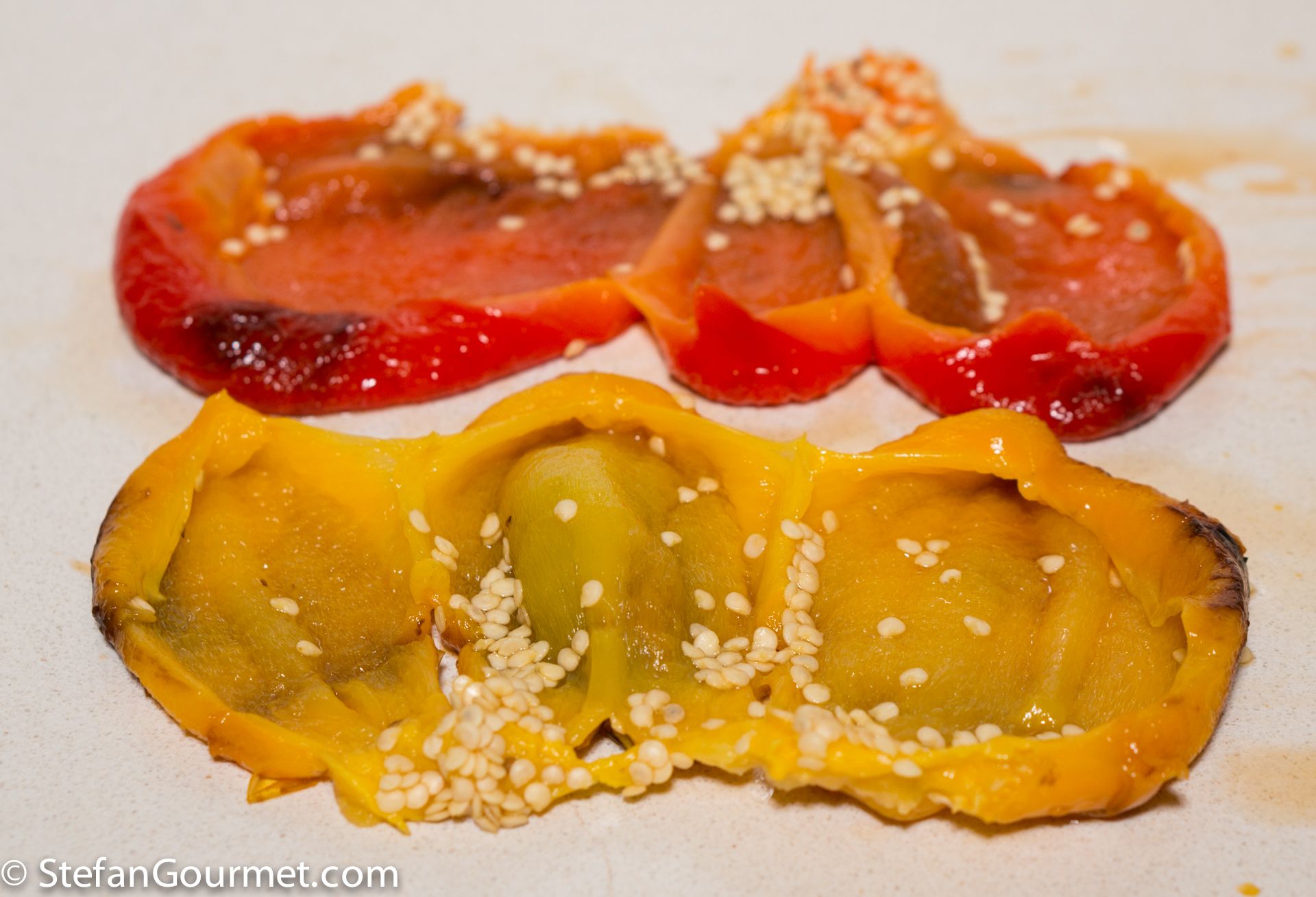 Meanwhile, roast the bell peppers in the oven at 250C/480F until they are blistered all over. Then allow them to cool in a closed plastic bag. This will make it easier to peel them. Lower the oven temperature to 225C/440F.