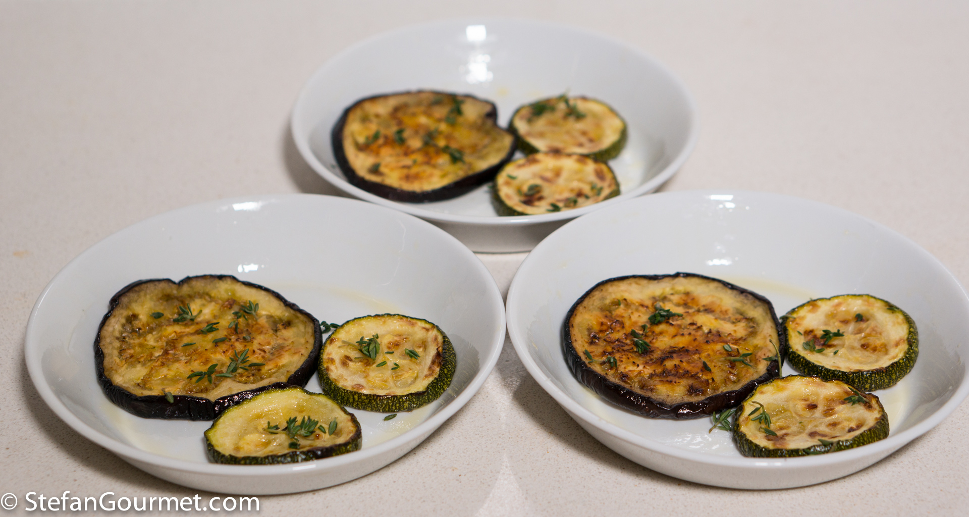 Roast the eggplant and zucchini at 225C/440F until they start to color, about 15 minutes. Then turn them around…