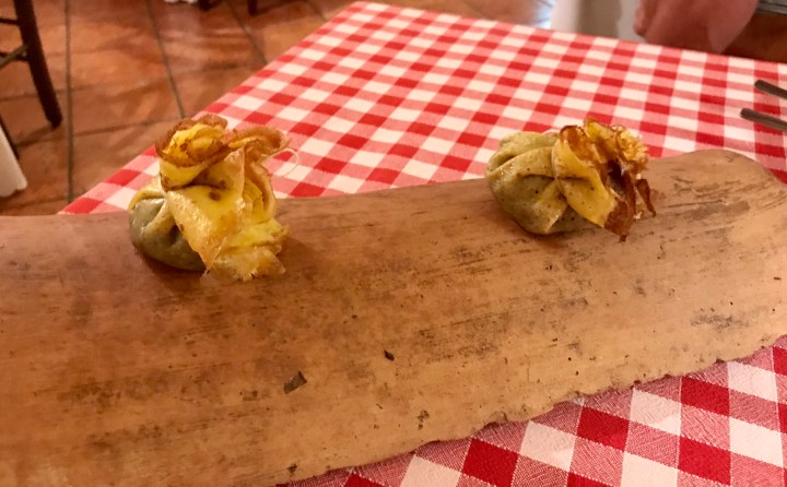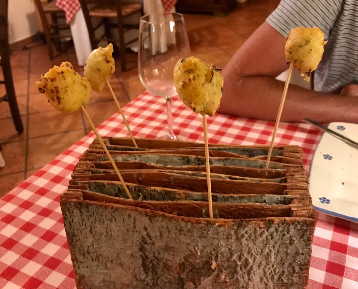 The next stop in our culinary tour of southern Italy is La Locandiera in Bernalda, near Matera in the region of Basilicata. Gambero Rosso has awarded it tre gamberi (three shrimp), which is the highest rating for a trattoria. We opted for the “gourmet” menu, comprising 4 antipasti, 2 primi, 1 secondo and 2 dolci for 50 euros including matching wines.