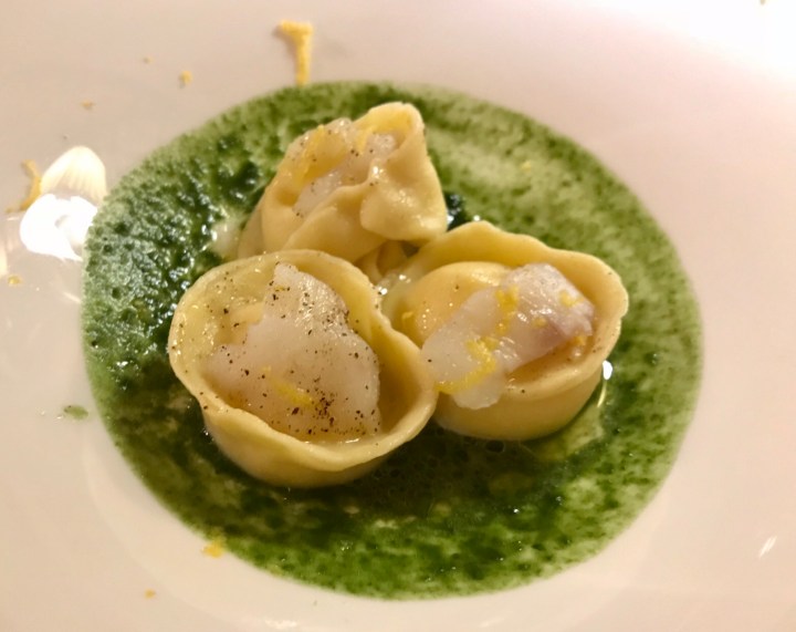 Ravioli filled with burrata and served with raw baccalà, lemon zest and chard puree. A very elegant dish, paired nicely with an Aglianico rosé.