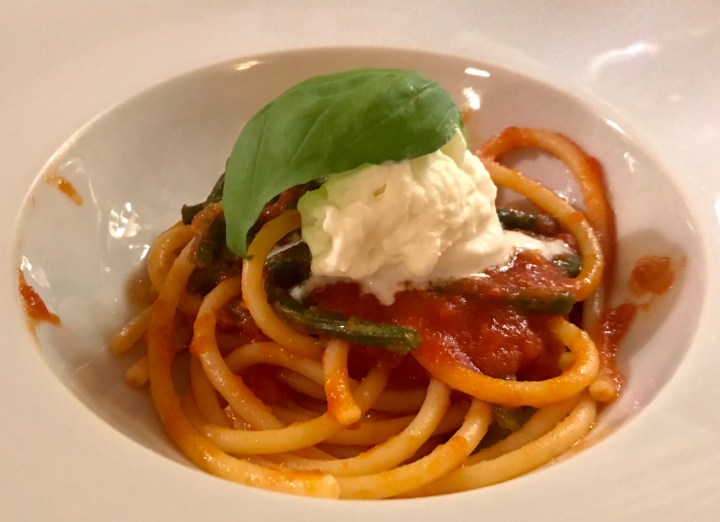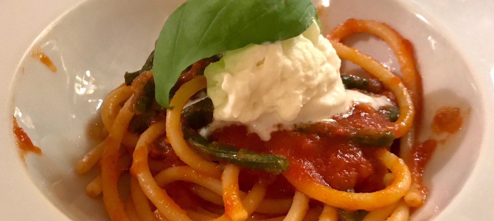 Bucatini from local what (Basilicata is the main producer of semola for pasta) with tomatoes, green beans, and stracciatella cheese (fresh cheese somewhat similar to burrata), paired well with a Primitivo/Aglianico blend from a winery that is only 8 kilometers (5 miles) from the restaurant. This was served with very flavorful (and very fiery) peperoncini in olive oil. This was wonderful due to the great tomatoes.