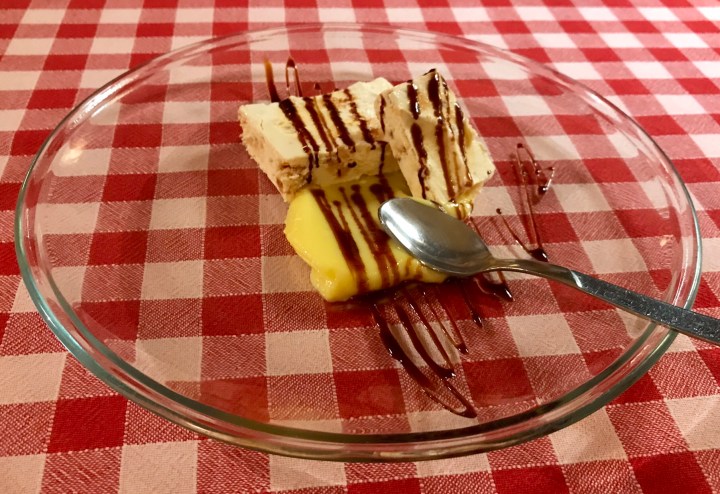 Semifreddo with pastry cream and Aglianico reduction, served with homemade liqueur made from Primitivo and cherries.