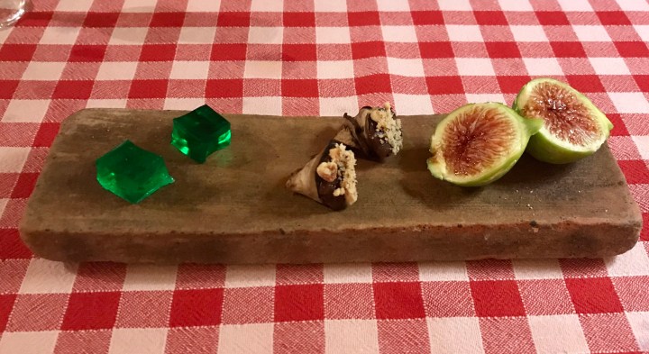 Fig, roasted eggplant with chocolate and hazelnut, and mint jelly.