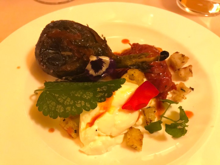 The antipasto: eggplant cooked in charcoal with a very creamy mozzarella, candied tomato, croutons and local herbs. The presentation was very nice, because the eggplant was made to look like a drumstick (hard to see in the photo). The eggplant, tomato, and mozzarella all had great flavor, and the combination is a classic one that works very well. The texture of the eggplant was outstanding, very meaty and very tender at the same time. The quality of the ingredients is what makes this dish work.