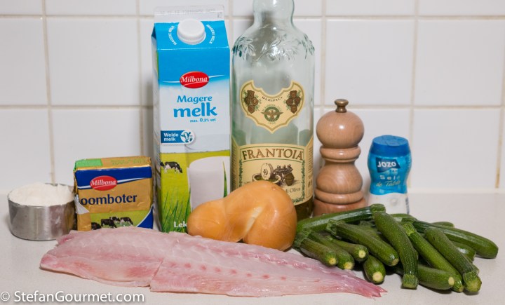 Ricciola is a fish that you can often find on the menu in restaurants in and around Naples and Palermo. Outside of Italy similar fishes are available as amberjack or kingfish (or greater amberjack, yellowtail amberjack, also related to the Japanese hamachi). At Taverna Estia they had used a 20 kilo (45 lbs) specimen, but luckily I could acquire one that was ‘only’ 1.8 kilos (4 lbs). It is related to mackerel, but with a much more elegant flavor. What I especially like about ricciola though is the texture, creamy and flaky without falling apart. The combination with the even more creamy smoked cheese and the zucchini is wonderful. For such a special dish, it is surprisingly easy to prepare. (Please note that the version at Taverna Estia was more elaborate with a more airy sauce and ‘green olives’.) For the ‘scales’ small but not tiny zucchini are the best. Unfortunately I could only find either regular (quite large) zucchini or mini ones, so I opted for the mini ones.