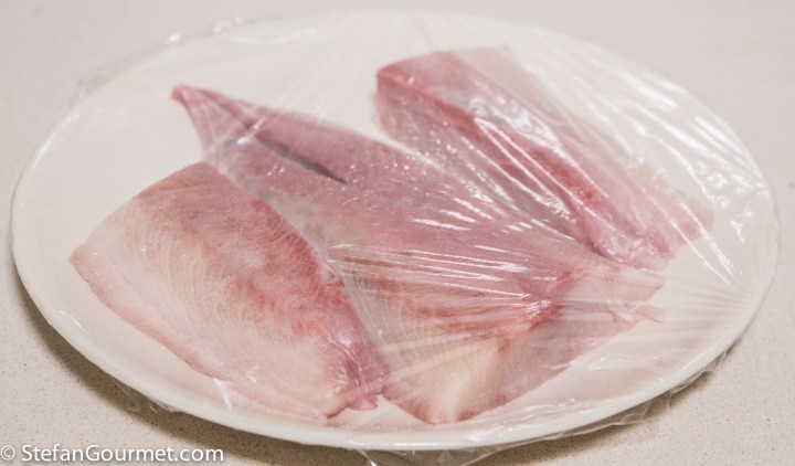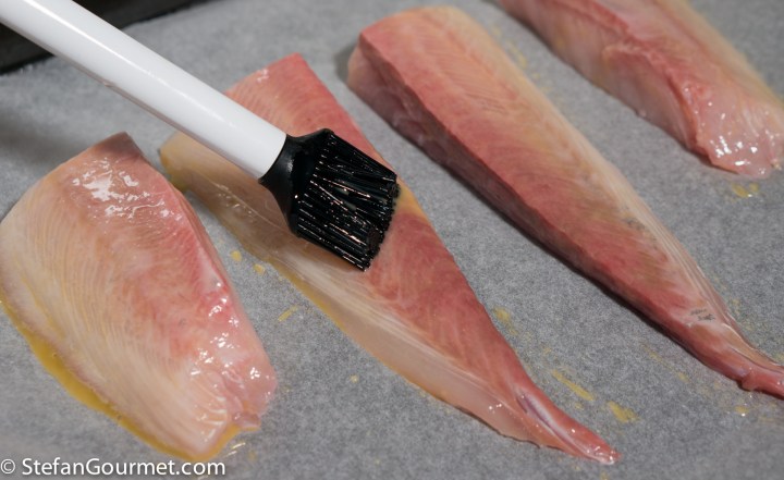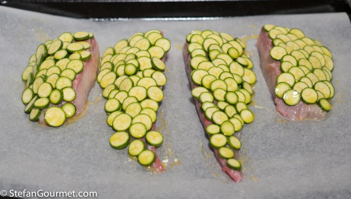 I brushed the fish with beaten egg so the zucchini would stick better. I am not sure that it actually worked. As mentioned in the introduction, it is probably easier with zucchini slices that are slightly larger.