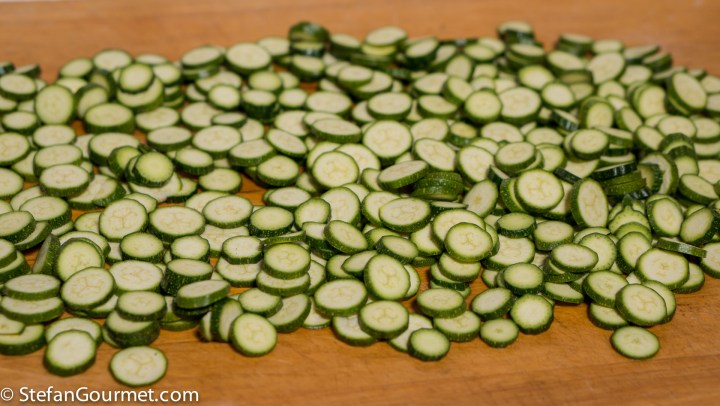 Meanwhile, slice the zucchini thinly. I used a mandoline.