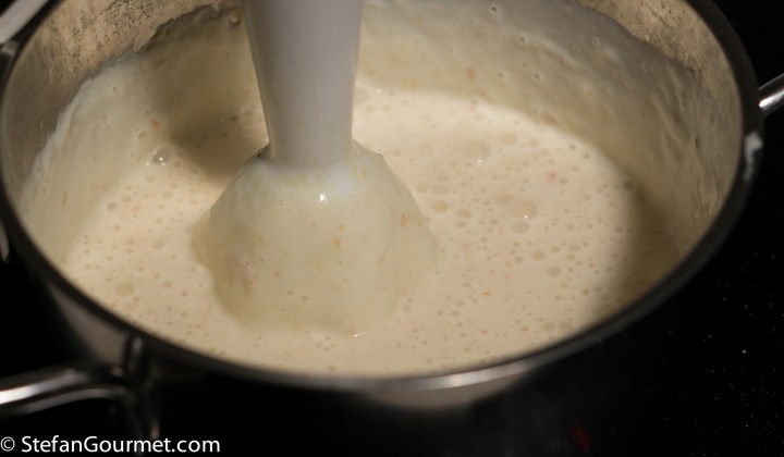 Now use an immersion blender to beat some air into the sauce and make it frothy.
