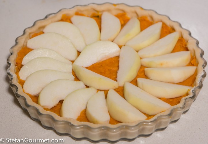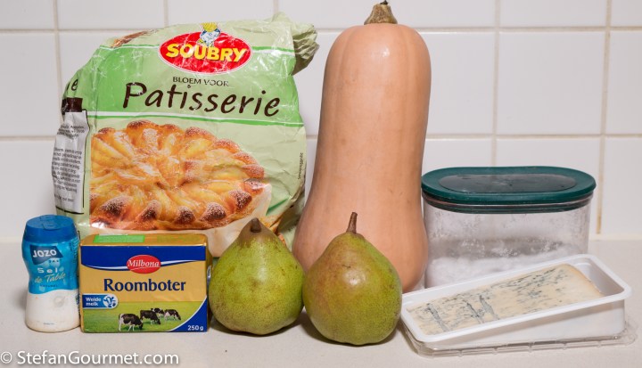 There is hardly any added sugar in this recipe; all the sweetness is the natural sweetness of the pears and the pumpkin or butternut squash. I was very happy with the result, as it is not very sweet at all but it is very tasty. The flaky crust and the lattice pattern make it more festive. I could also imagine this as a lunch, served with a green salad and perhaps some off-dry sparkling wine…