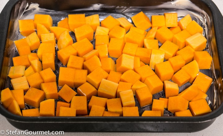 Butter an oven dish and spread out the diced pumpkin in a single layer.