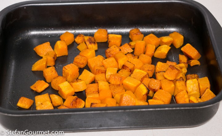 Roast the pumpkin in the oven at 225C/440F until it is soft and browned, about 30 minutes, stirring after about 15 minutes for more even browning.