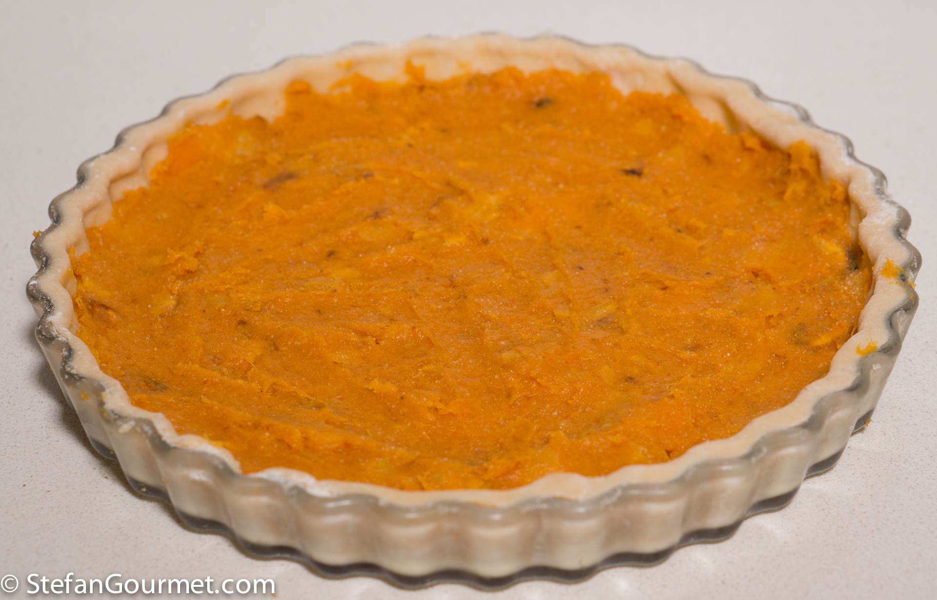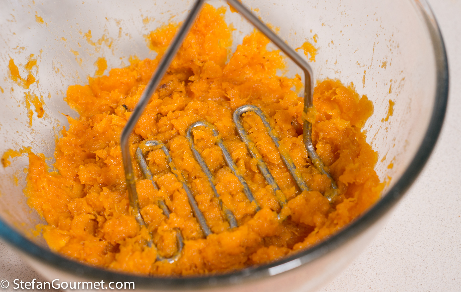 Mash the pumpkin and allow to cool. Lower the oven temperature to 180C/350F.