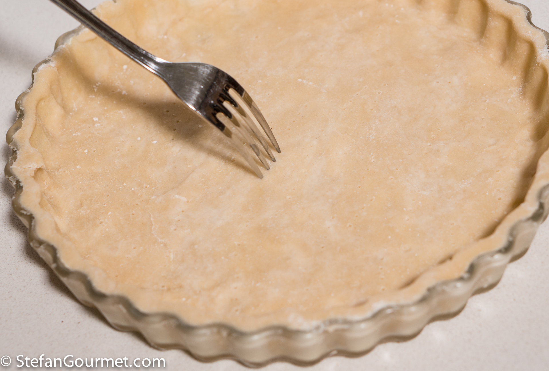 Meanwhile, roll out 2/3 of the dough into a 32 cm (13″) circle. Butter a pie dish (I prefer a glass one for this type of pie) and line it with the dough you just rolled out. Pierce the bottom with a fork all over…