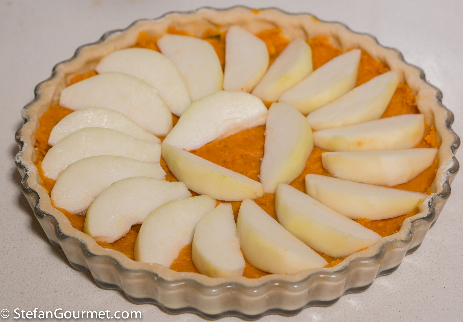 Peel and core the pears, and slice into wedges. Cover the pumpkin puree with a single layer of pear wedges.