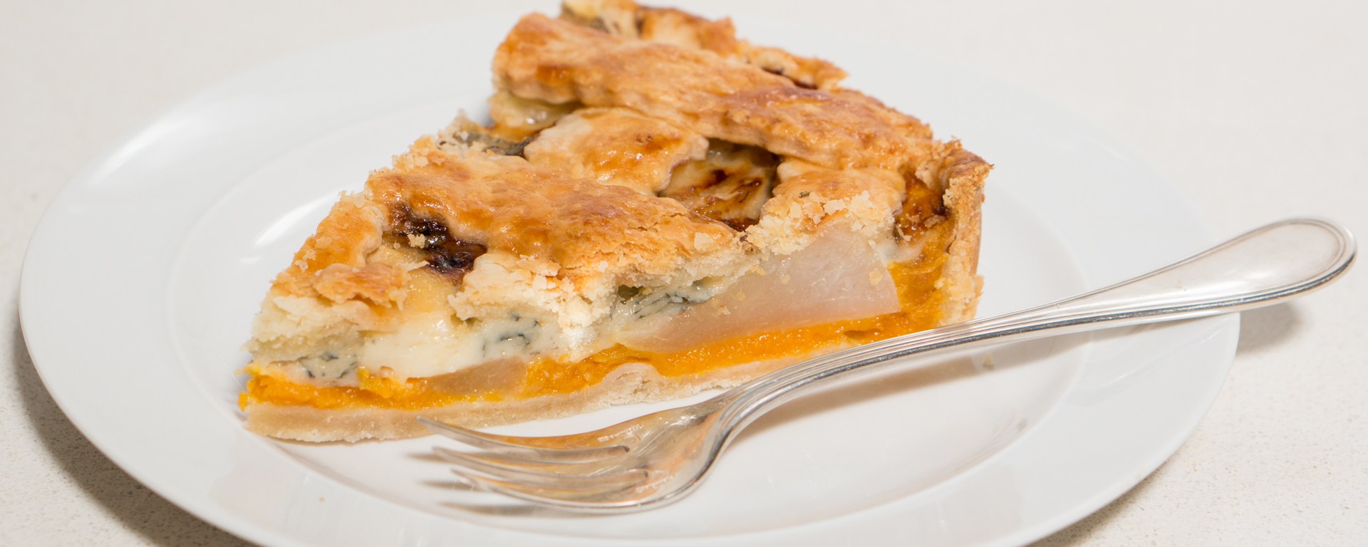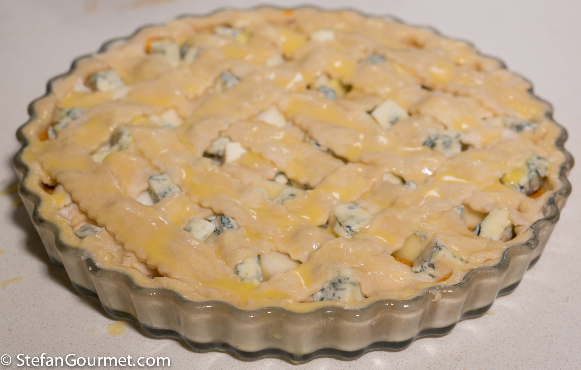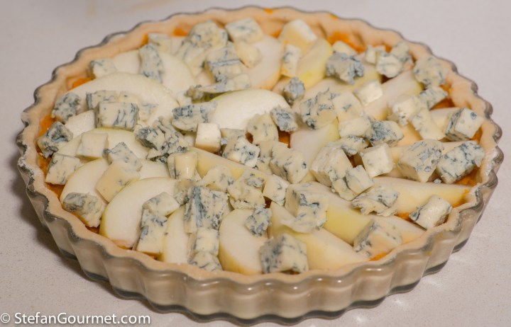 Pumpkin season has arrived. We did not have this pie during our recent trip to Italy, but the inspiration for it did come from Italy. Paola recently blogged about a pumpkin, gorgonzola, and pear tart. I have combined gorgonzola and pears before as well as gorgonzola and pumpkin, but not yet all three of them together. That really appealed to me, and I thought that it would be nice to make it with a flaky crust and serve it as a cross between a cheese course and a dessert, accompanied with a semi-sweet dessert wine.