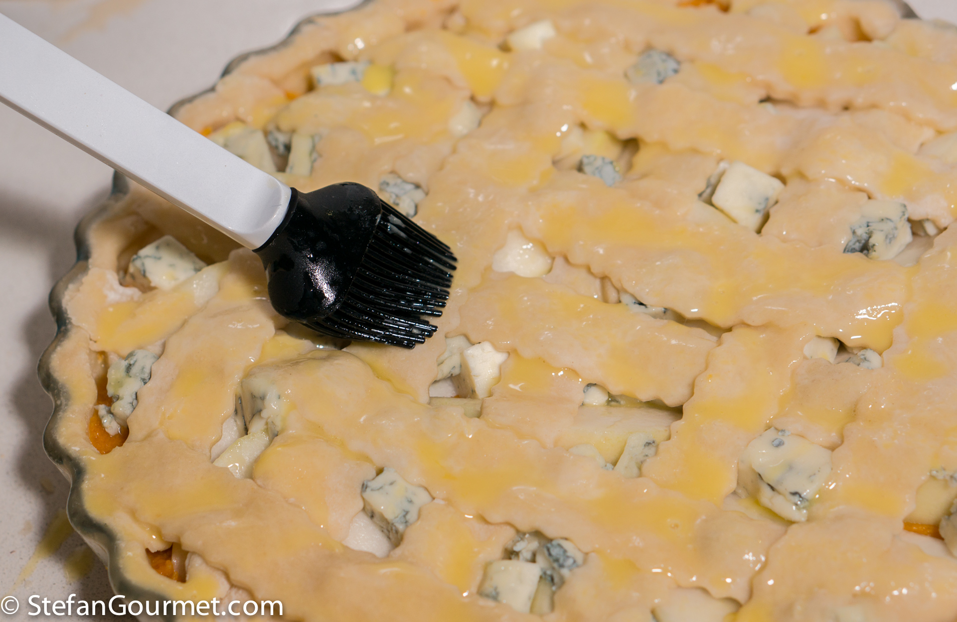 Roll out the remaining dough and cut it into ribbons. Cover the pie with a lattice of those ribbons, then brush them with beaten egg.