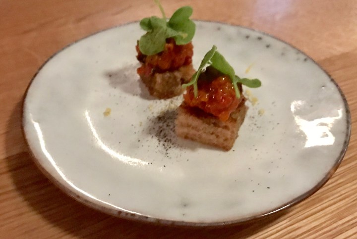 The amuse bouche is beef and smoked bell pepper tartare on a piece of toast, very tasty with a lovely smoky flavor.