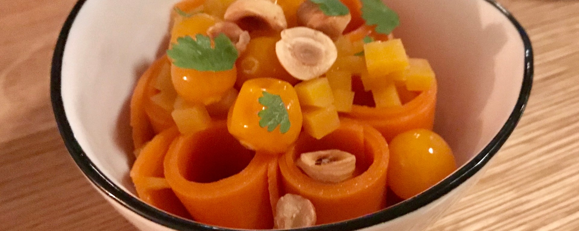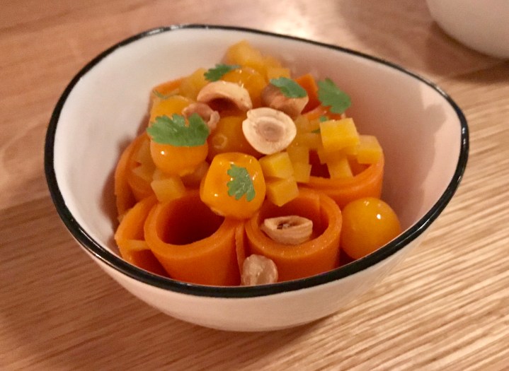 The first wine is a Chenin Blanc from Swartland in South Africa. It is more elegant than the usual Chenin from that area, with great freshness and elegance. It comes with two dishes, the first of which is butternut squash with hazelnuts and physalis (also known as ground cherries, large orange tart berries). It is a nice combination of tastes and textures that works well with the wine.