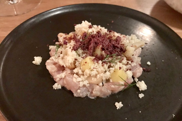 The following wine was a Chardonnay and Sauvignon Blend from Steiermark in Austria from 2006. The first dish served with it is tartare of Arctic char with cauliflower ‘rice’, lemon, and black olive. A nice dish that works well with the wine.