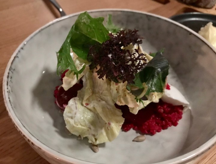 The next wine is a field blend (Gemischter Satz) from Austria that is a ‘natural wine’ (unfiltered and without sulfite). It has a great aroma and is very elegant for a natural wine (which can be very outspoken). The first dish with this wine is steamed carrot with amaranth, parsley, and bone marrow mayonnaise. The latter is very tasty and makes this a very nice dish that works well with the wine.