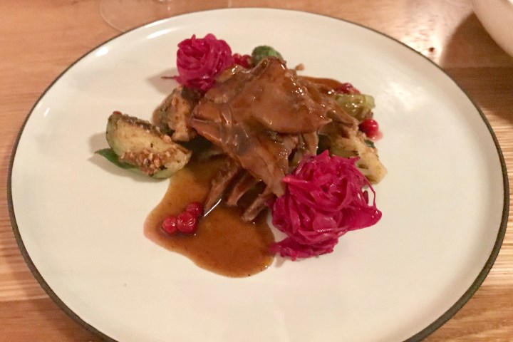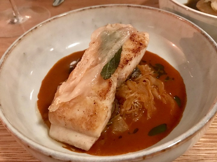 Time for a red wine: a Saint-Joseph from the Northern Rhone valley, syrah (shiraz) that was very complex and elegant. It seemed a bit young by itself (2014), but with the dishes the wine was perfect. The first dish was duck leg with red cabbage and Brussels sprouts with peanuts. The duck was nicely tender…