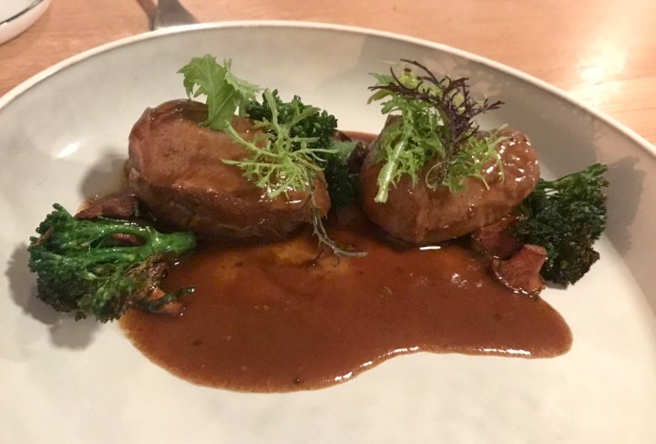 …but not as tender as the braised pork cheeks with broccoli and chanterelle mushrooms. The wine was magnificent with this dish and the pork cheeks were perfect, so tender and flavorful.