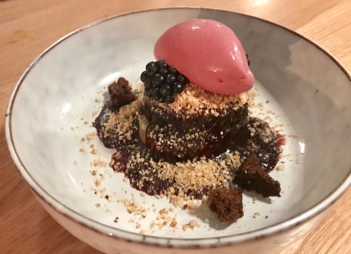 The second one blackberry with malt and amaranth. What was described as malt was some kind of brown cake, not chocolate but with a lighter flavor that was very nice with the blackberries and the wine. When I saw this dessert I thought it may not work with the Riesling, but in fact it did work very well.