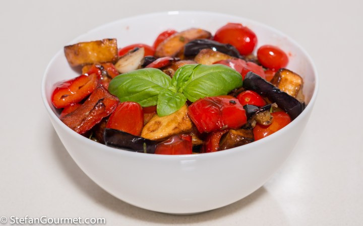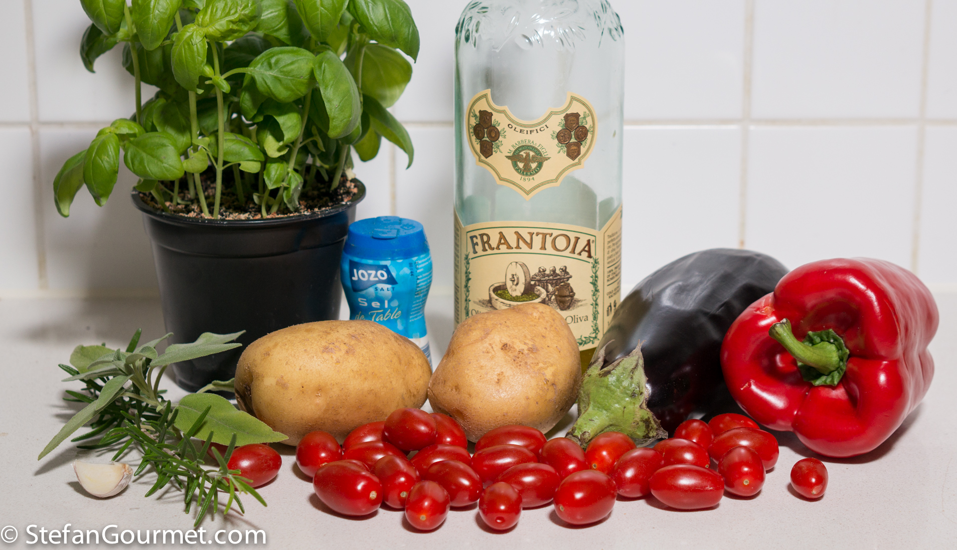 Cilento is an area in the south of Campania, and when I was there I enjoyed a dish called Ciambotta alla Cilentana. There are many versions of ciambotta, but here it is potatoes, eggplant, bell peppers, and tomatoes. It reminded me a lot of the French ratatouille (which usually does not have potatoes and would include zucchini), and ratatouille is usually cooked to a softer consistency.