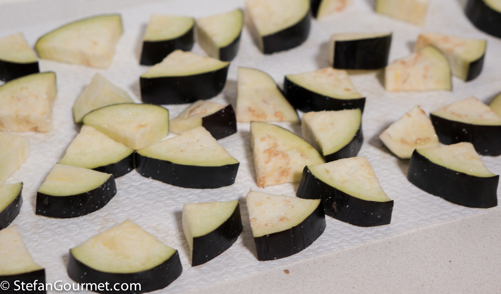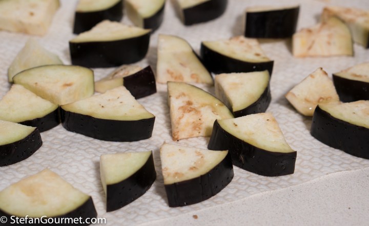 In the meantime, the eggplant should have released a lot of water. Pat the eggplant dry with paper towels…