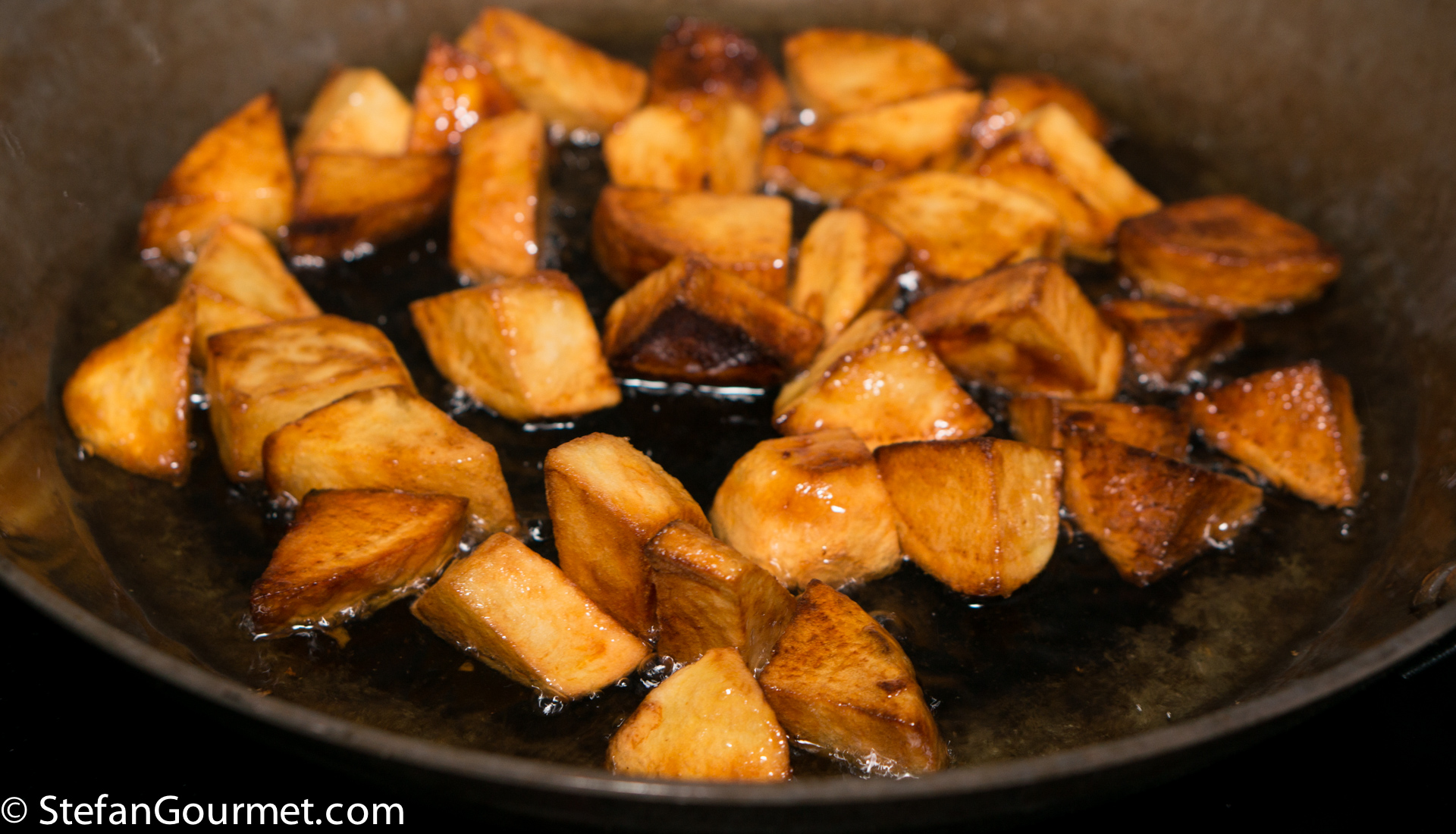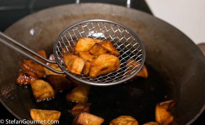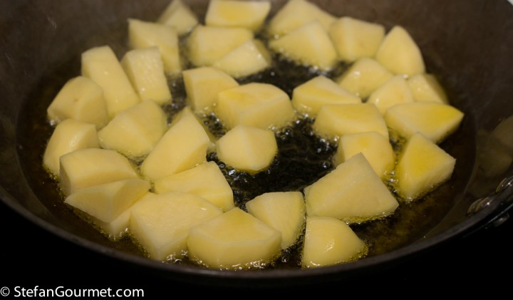 Peel the potatoes and cut them into chunks, again of uniform size. Heat olive oil in a frying pan and add the potatoes.