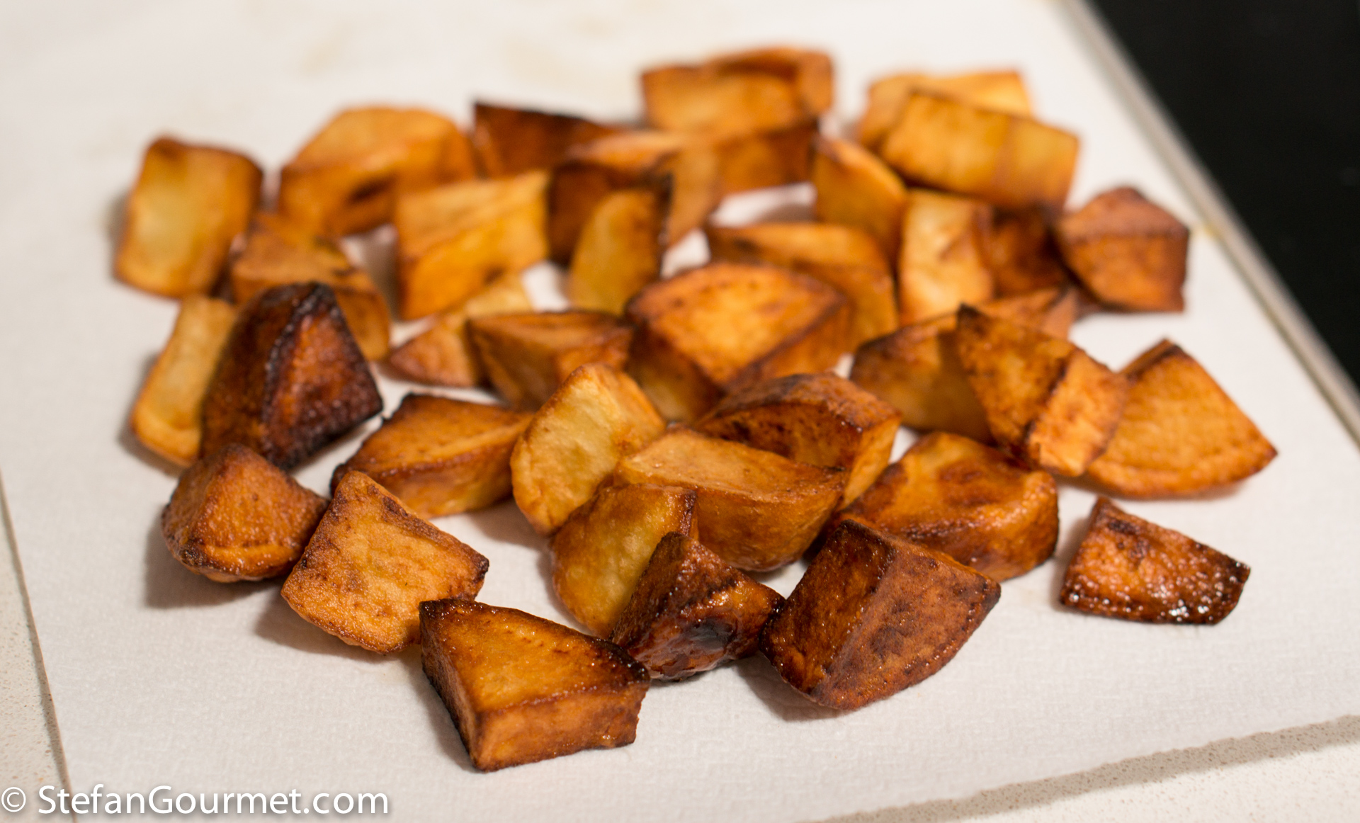 Cook the potatoes over medium high heat, stirring regularly, until they are tender inside and golden on the outside.