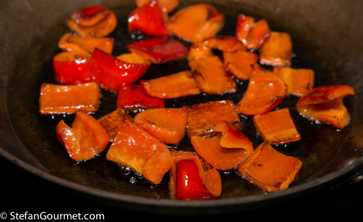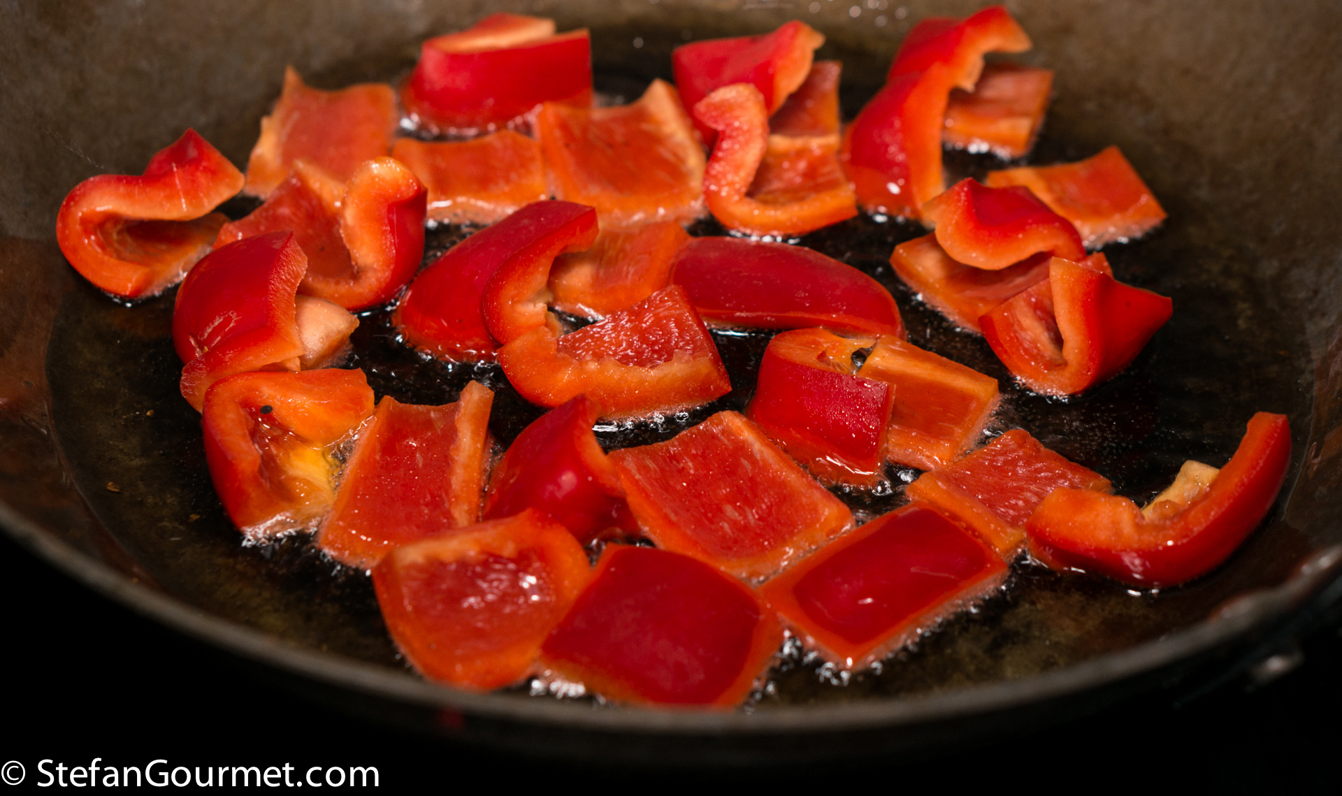 Cook the bell pepper over medium high heat until starting to soften and slightly charred. Lift the bell pepper out of the pan with a strainer and allow to loose excess oil on kitchen paper.