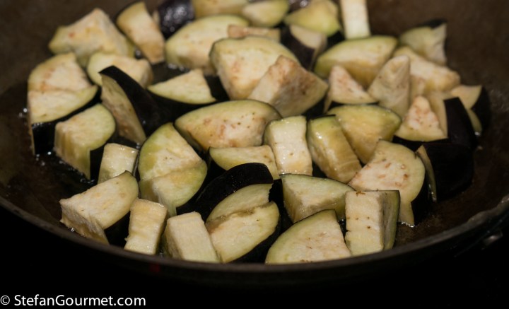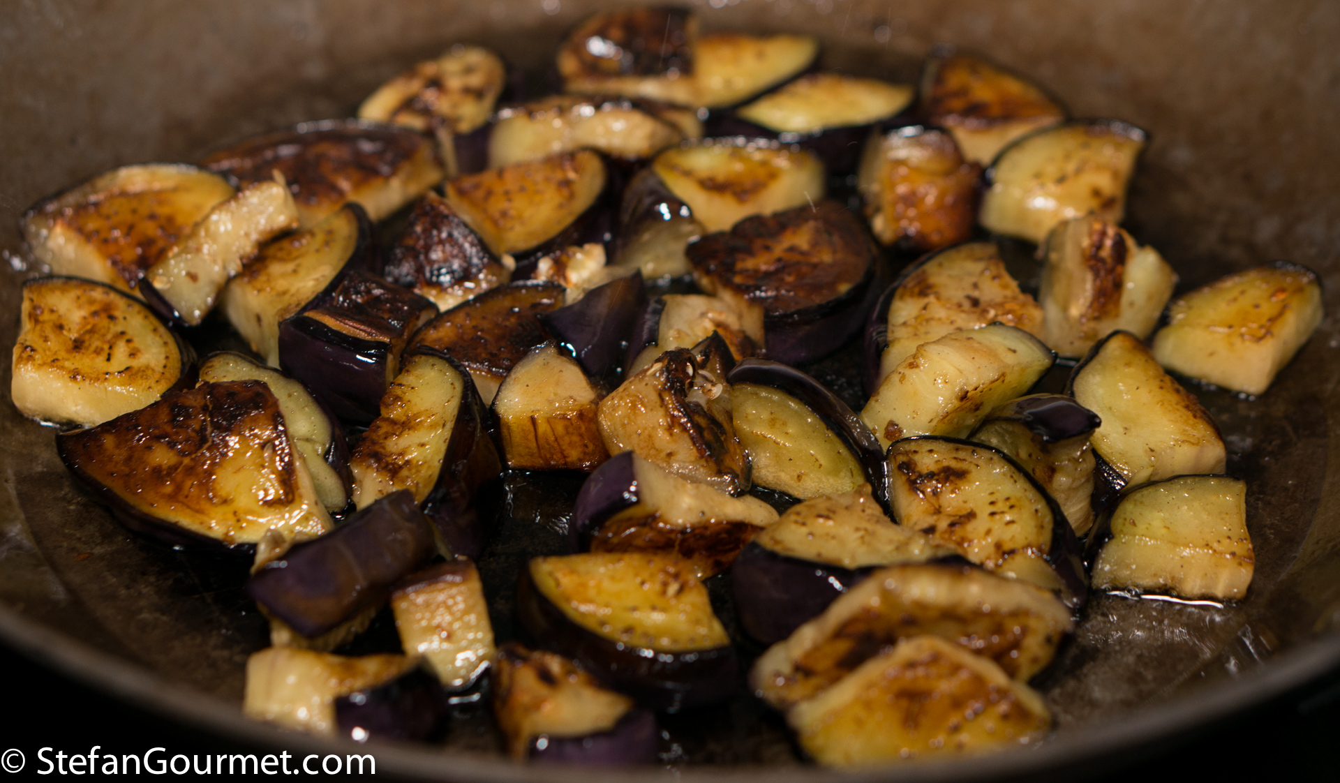Cook the eggplant over medium high heat, stirring regularly, until cooked through and nicely browned.