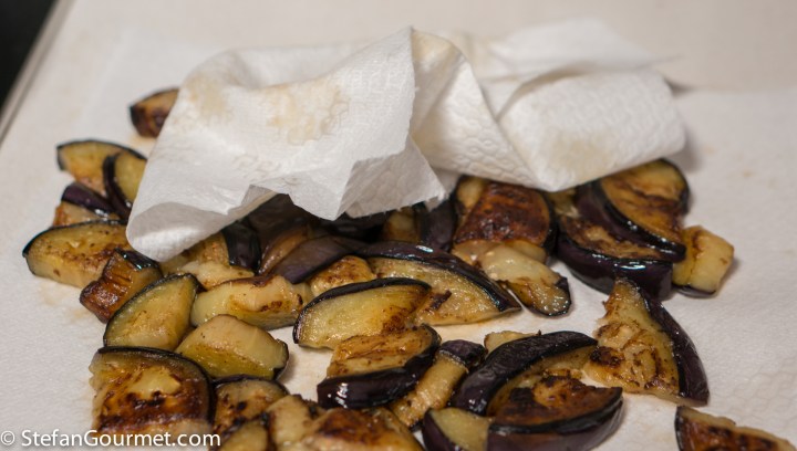 Lift the eggplant from the pan blot with kitchen paper to remove any excess oil.
