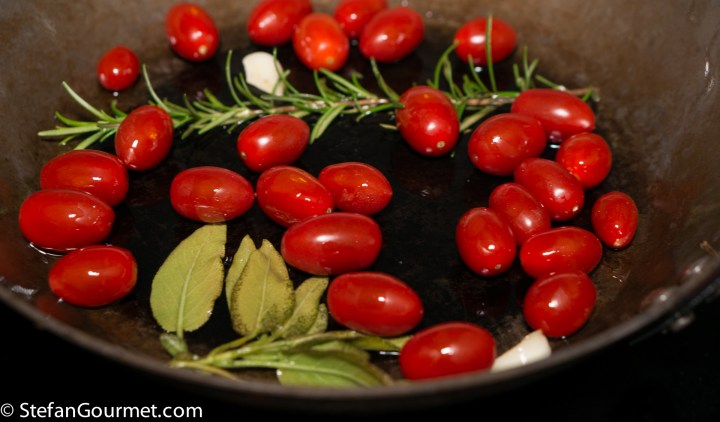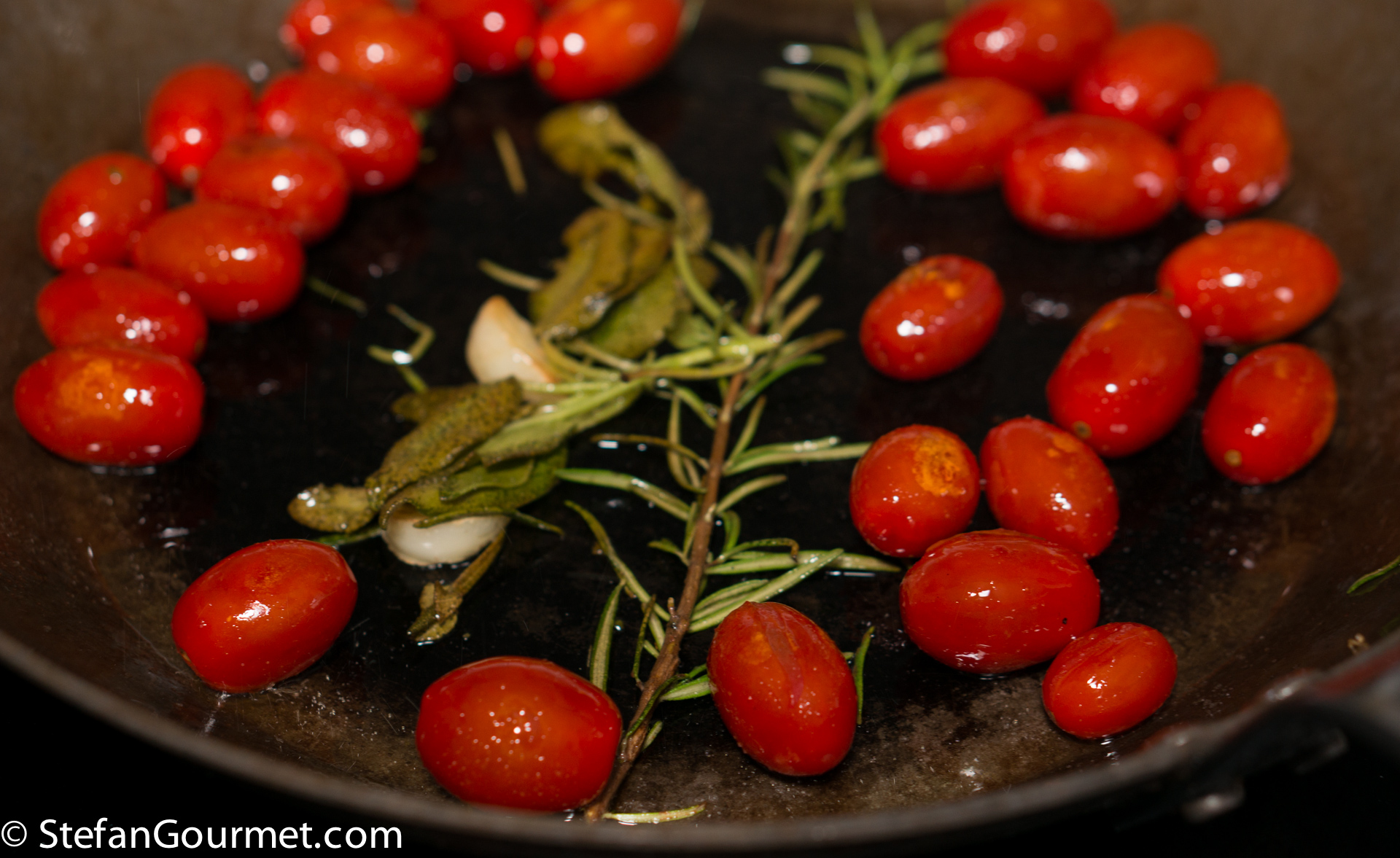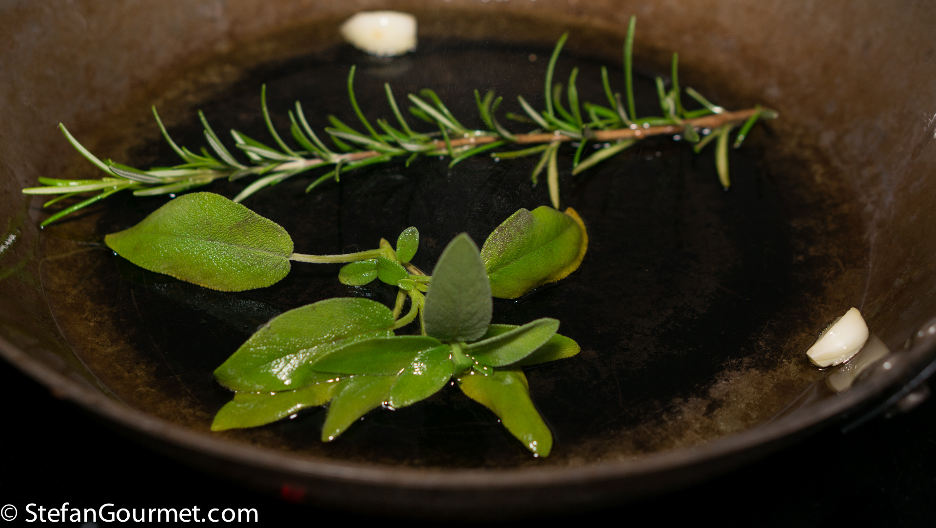 Wipe the pan clean with kitchen paper. Add a bit of olive oil and garlic, rosemary, and sage.