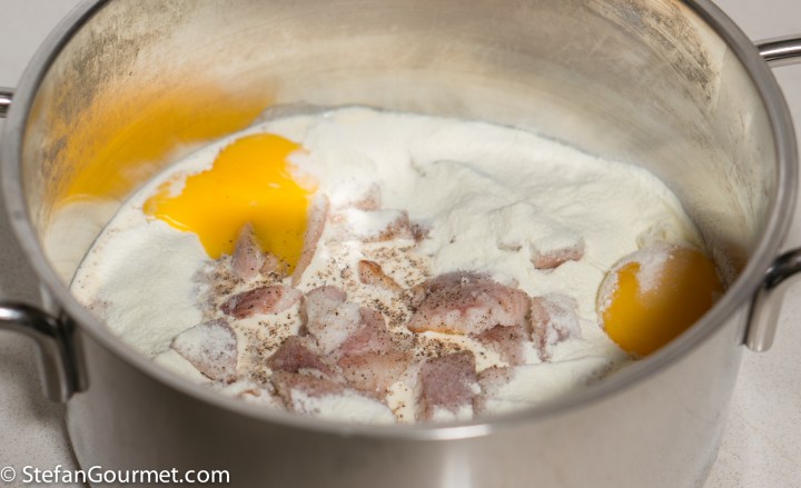 Combine the chopped eel, heavy cream, egg yolks, skim milk powder, 1/2 teaspoon of salt, and freshly ground black pepper in a saucepan.
