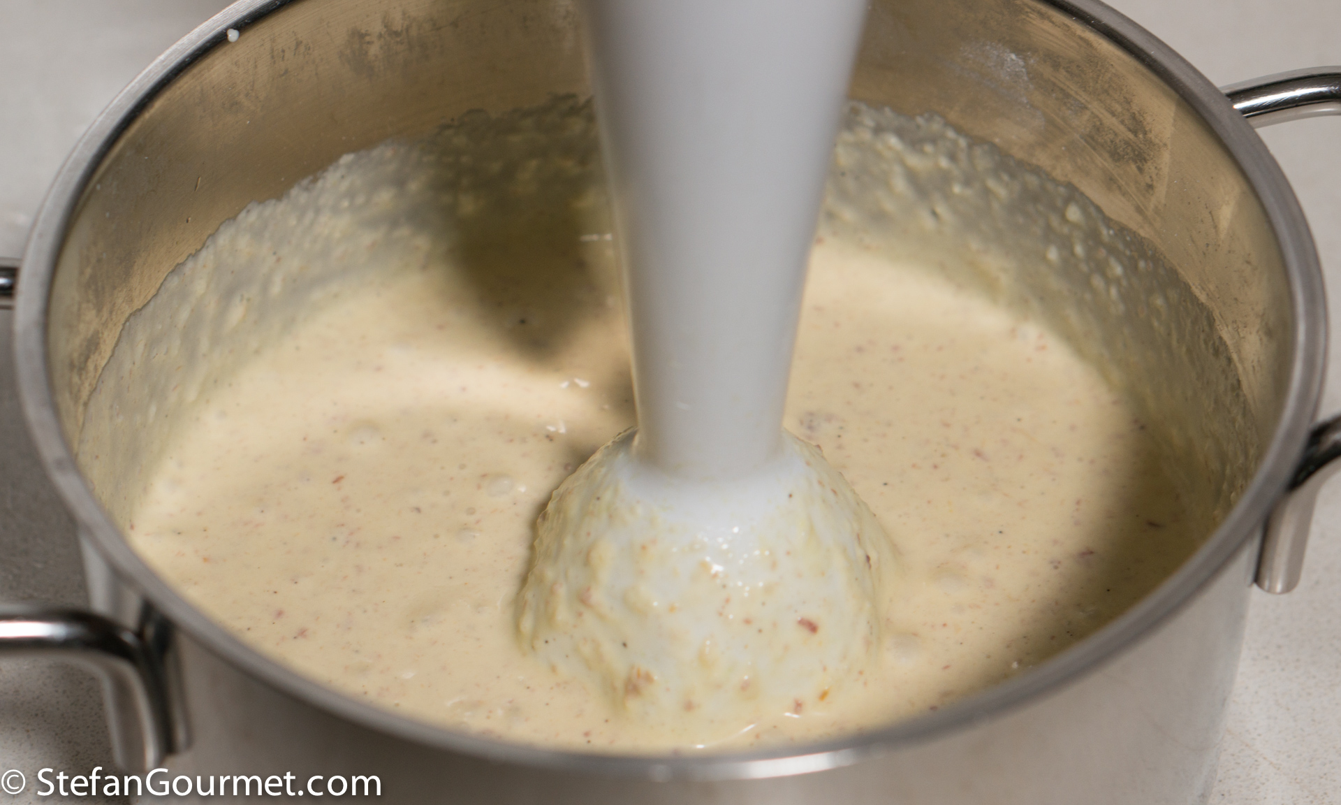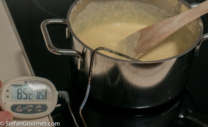 Heat the mixture to 85C/185F over medium heat, while stirring constantly. Turn off the heat as soon as the temperature is reached.