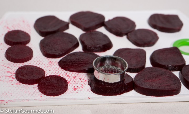 Slice the beets and then use a cookie cutter to make nice even slices. (Reserve the trimmings for another use.) Season the beets with a bit of salt.