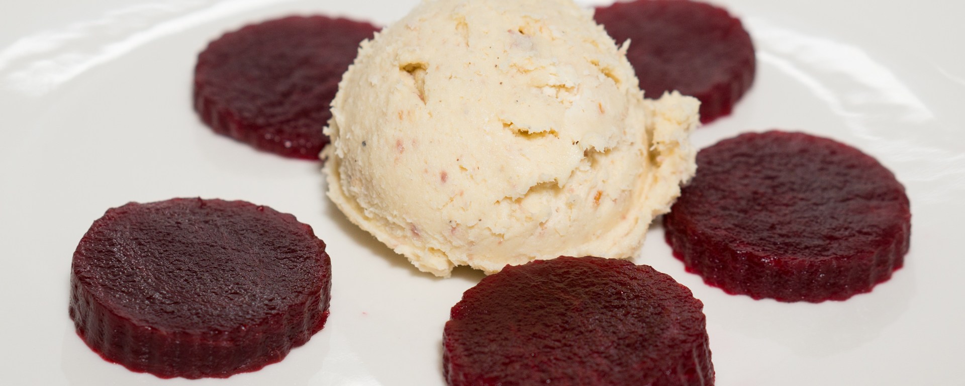 Serve a scoop of eel ice cream per person with the beet slices for garnish.