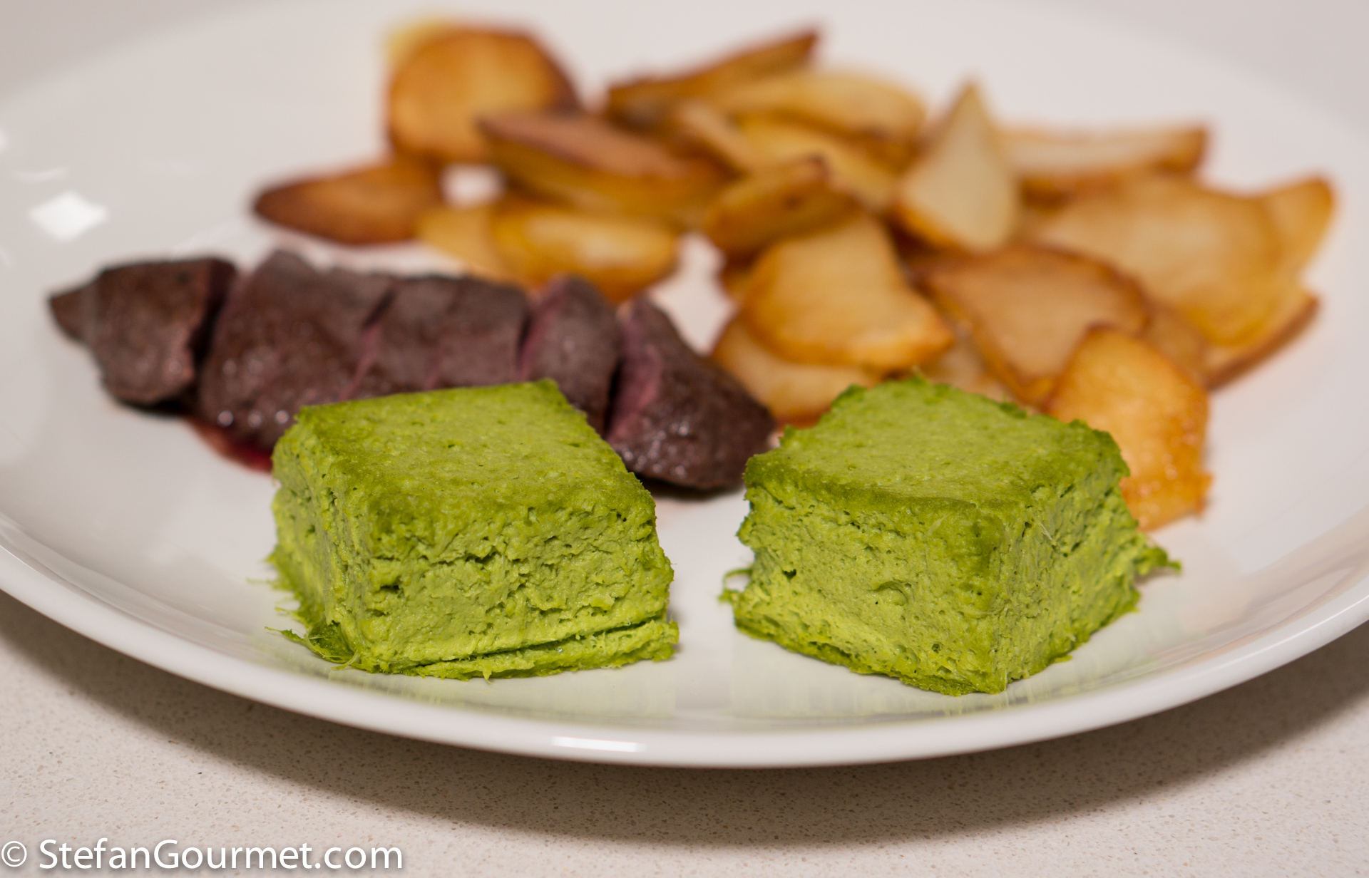 Leek Royale is a great way to turn the humble leek into a fancy side for a special occasion. Royale de Poireaux is a French side dish that is essentially a leek ‘custard’ made with eggs and cream. The green part of the leeks is used, so for once you can save the white parts for another use. Leek Royale is a great side dish with either fish or meat; above it is pictured as a side to venison steak and fried potatoes. The leek royale doesn’t look as good as it will when it’s freshly made, because I had made these the day before and reheated the squares in the oven.